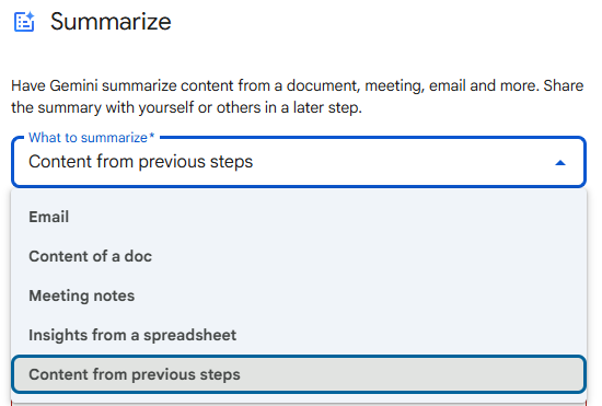 最初のActionsでは「Summarize」を選択して、What to summarizeのプルダウンの中の「Content from previous steps」を選択します。