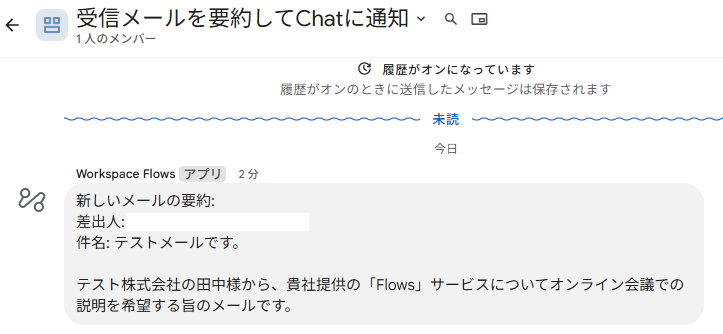 そうすると以下の要約されたChatも送信されてきました。ChatはFlowsのアプリから届くような動きになっています。