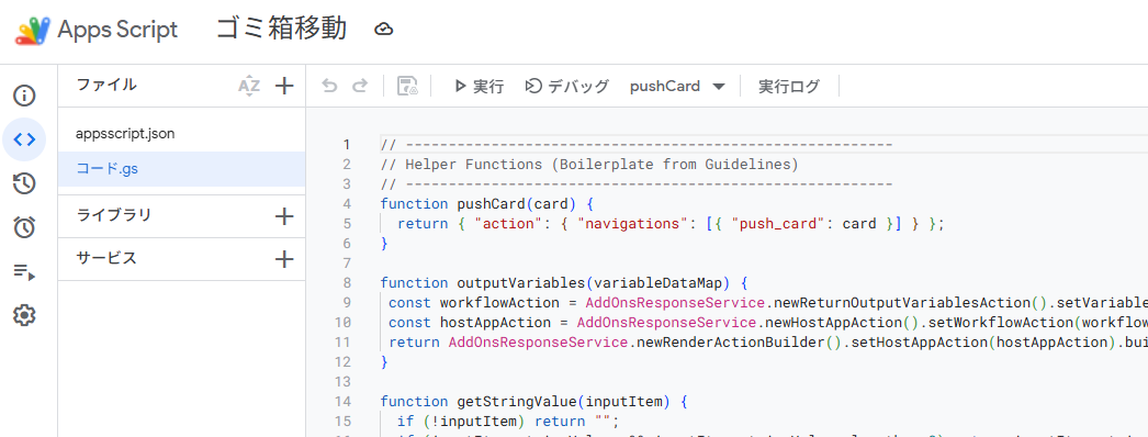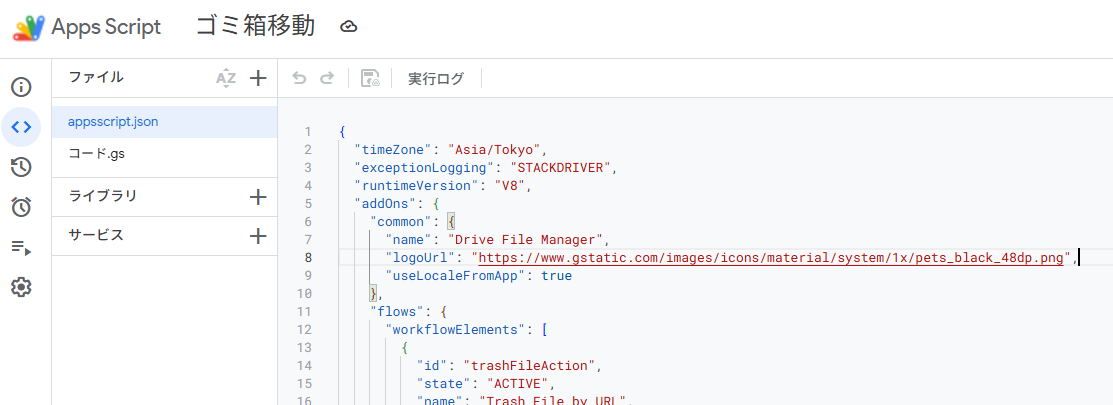 設定が完了したらエディタの画面に戻ってください。そして、ファイルの中の「appsscript.json」ファイルを選択して、エディタに以下の内容を入力して保存してください。