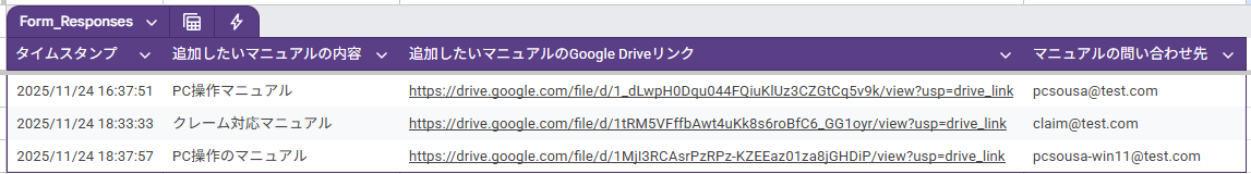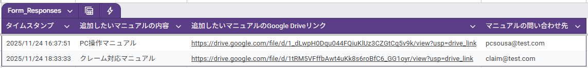 - 新しい連絡先やマニュアルURLがFormから届いたら、自動でマスタへ反映されます。