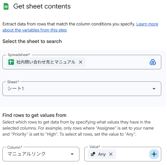 次のActionsではもう一度「Get sheet contents」を選択します。Spreadsheetの欄には社内マニュアルマスタであるスプレッドシート「社内問い合わせ先とマニュアル」を選択し、Sheetには「シート1」を選択してください。そして、Find rows to get values fromでは、Columnには「マニュアルリンク」、Valueには「Any」を入れてください。