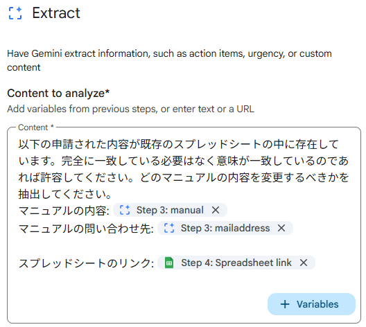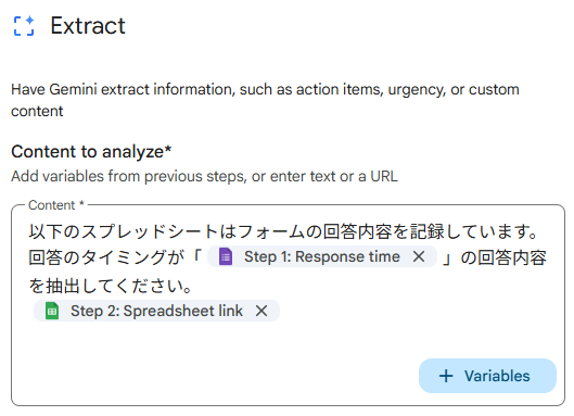続いての「Extract」ステップではGoogle Formの回答内容から情報を抽出するため、Enter a promptの欄には以下のプロンプトを入力して。[]で囲まれている内容はVariablesから設定するようにしてください。