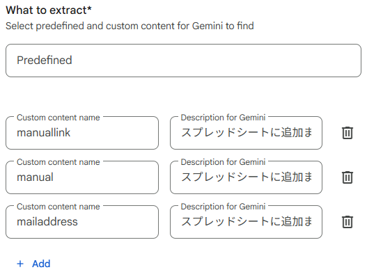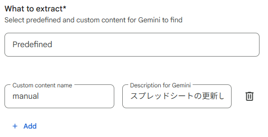 そして、Custom content nameには「manual」を入力し、Description for Geminiには「スプレッドシートの更新したいマニュアルの内容」を入力します。