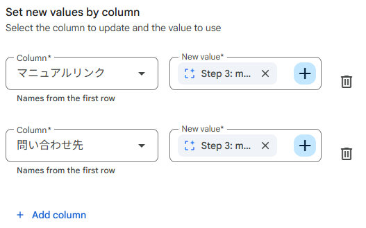 そして、更新する内容であるSet new values by columnの設定を実施します。内容の変更は2つの項目のみとなります。