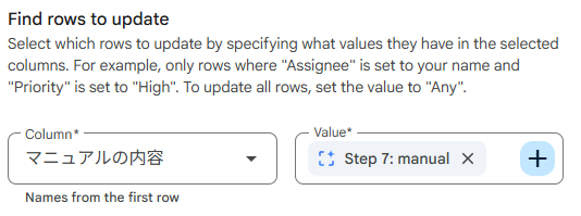 そして、更新する場合の処理の最後のサブステップ「Update rows」では、Spreadsheetの欄には社内マニュアルマスタであるスプレッドシート「社内問い合わせ先とマニュアル」を選択し、Sheetには「シート1」を選択してください。そして、Find rows to updateでは、Columnには「マニュアルの内容」、ValueにはStep7で抽出した情報となる「Step7: manual」を入れてください。