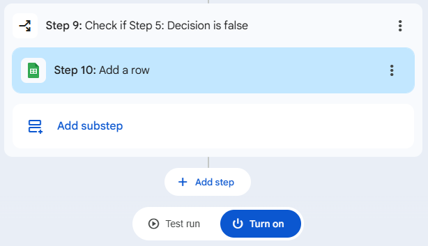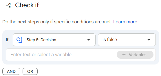 また、Step5のDecideの内容によって処理を変更するステップのもう片方を設定します。Step9では既存のマニュアルマスタに存在していない場合の処理となるので「Step5: Decision」が「is false」となるようにしてください。