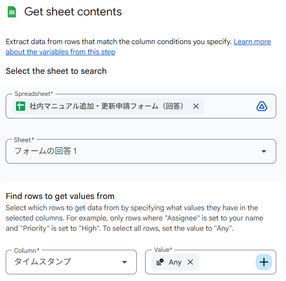 最初のActionsでは「Get sheet contents」を選択します。Spreadsheetの欄にはGoogle Formの回答を記録しているスプレッドシート「社内マニュアル追加・更新申請フォーム(回答)」を選択し、Sheetには「フォームの回答 1」を選択してください。そして、Find rows to get values fromでは、Columnには「タイムスタンプ」、Valueには「Any」を入れてください。