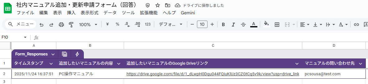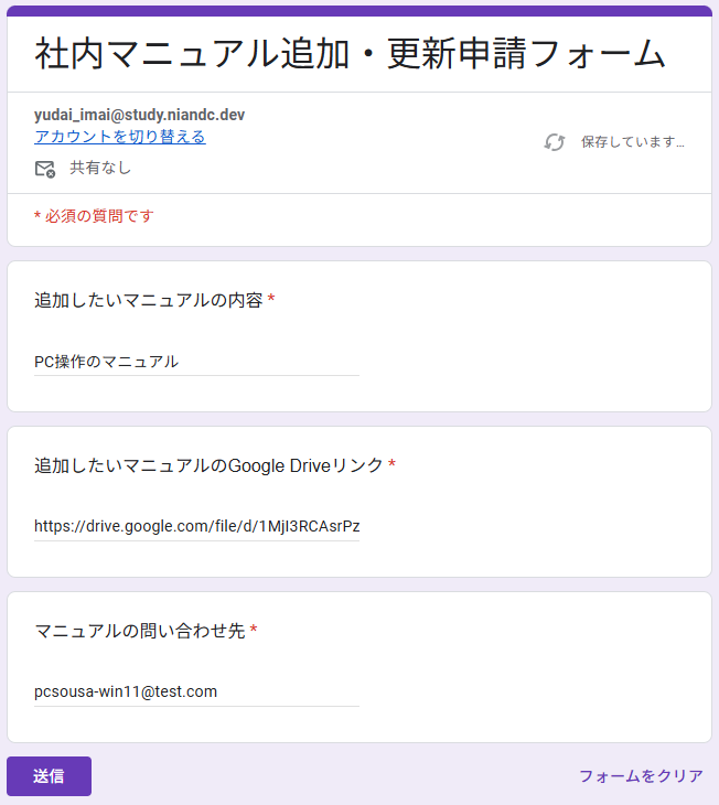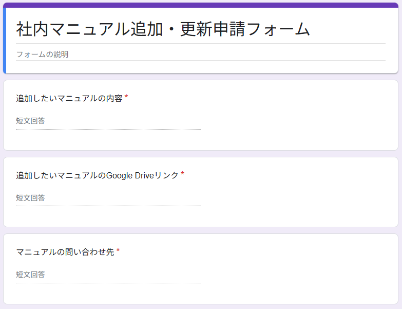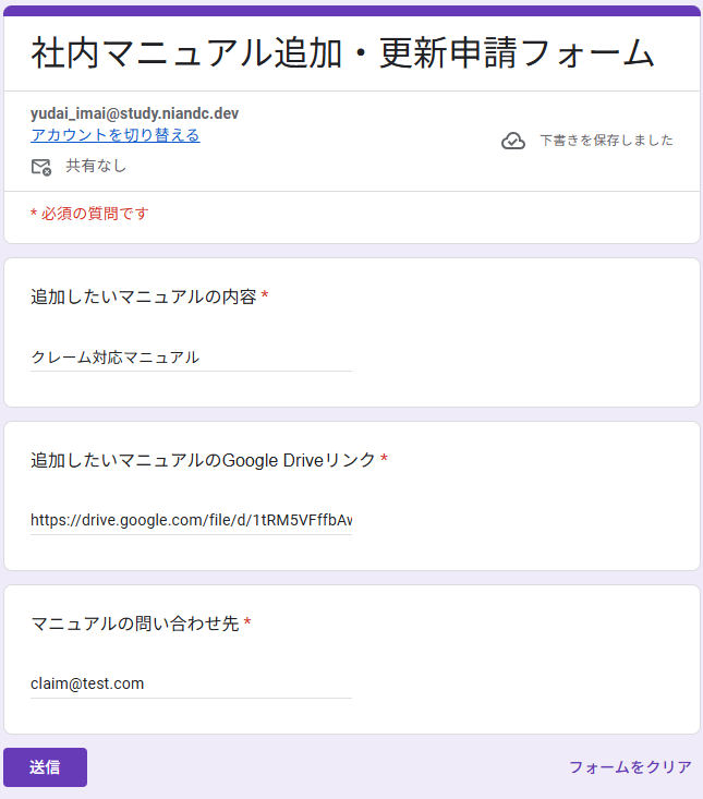 そして、現在の社内マニュアルマスタには存在しないクレーム対応マニュアルをGoogle Formから新規追加で申請してみようと思います。