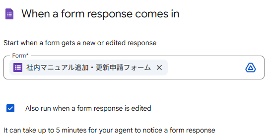 Starterで「When a form response comes in」を選択します、そして、Formには先ほど作成した「社内マニュアル追加・更新申請フォーム」を選択します。Also run when a form response is editedのチェック項目は回答が編集されたときもエージェントを実行されるようにしたいかどうかでチェックするかどうかを決めるところで、今回はチェックしておくようにします。