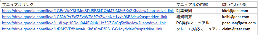 | manuallink | スプレッドシートに追加または更新したいマニュアルのファイルへのリンク |