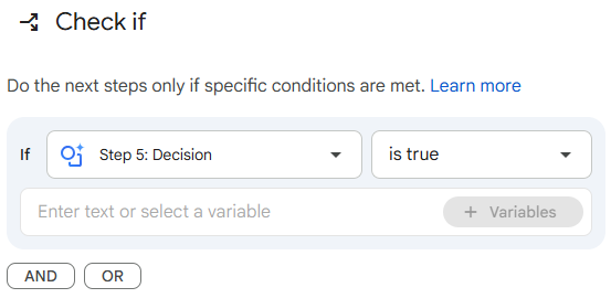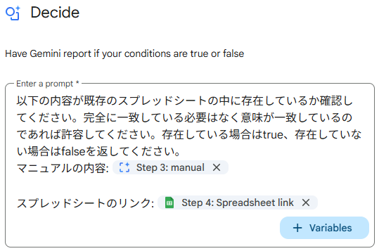 次は「Decide」ステップで申請内容と既存のマニュアルマスタを比較する処理を実施して既存の内容を更新する必要があるのか、新規で追加する内容なのかの判定を実施します。Enter a promptの欄には以下のプロンプトを入力して。[]で囲まれている内容はVariablesから設定するようにしてください。
