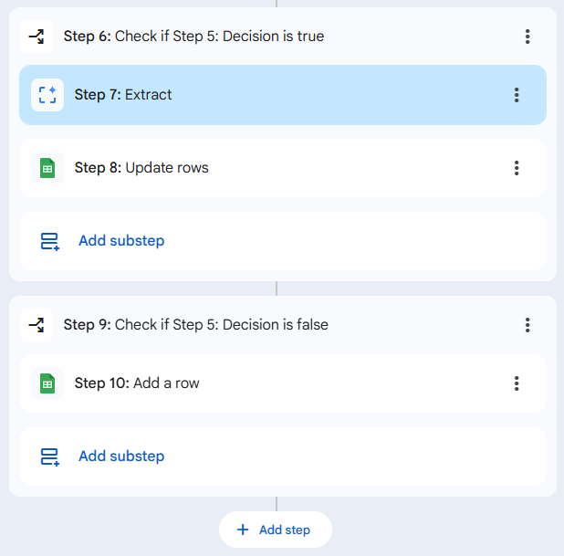 手前の判定の結果、既存のマニュアルマスタの中に存在する場合は、どのマニュアルと被っているかを「Extract」ステップで抽出してから「Update rows」ステップで既存の行を更新します。既存のマニュアルマスタの中に存在しない新規の内容の場合は、「Add a row」ステップでそのままマニュアルマスタの最後尾に行を追加する仕組みとしています。