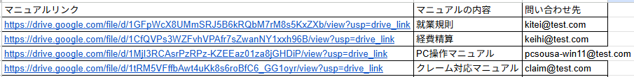 | manual | スプレッドシートに追加または更新したいマニュアルの内容 |