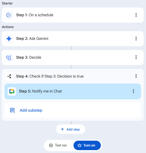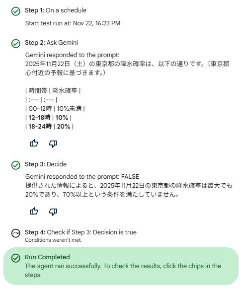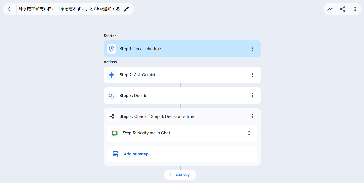 続くアクションでは、まずGeminiの「Ask Gemini」ステップで特定の地域の天気情報を取得し、その後の「Decide」ステップでその天気情報から降水確率がしきい値を超えているか判断しています。そして、その後に結果を「Check if Step3: Decision is true」で判定して、しきい値を超えている場合は「Notify me in Chat」ステップでGoogle Chatへ傘を忘れないためのリマインド通知を送るような作りとしています。