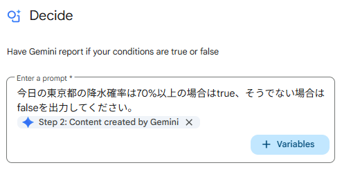 次のStepには「Decide」を選択してください。そして、Enter a promptには「今日の東京都の降水確率は70%以上の場合はtrue、そうでない場合はfalseを出力してください。」と入力した後に、VariablesからStep2で生成した内容を「Step2: Content created by Gemini」として追加してください。