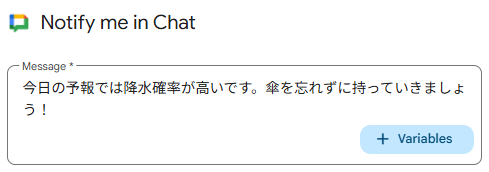 そして、substepには「Notify me in Chat」を選択し、Messageには「今日の予報では降水確率が高いです。傘を忘れずに持っていきましょう!」と入力して完了となります。