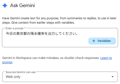最初のActionsでは「Ask Gemini」を選択して、Enter a promptの欄に「今日の東京都の降水確率を出力してください。」と記入します。この時の地域は好きな地域に変更してもらえればと思います。Sources Gemini can useのプルダウンは「Web only」を選択します。