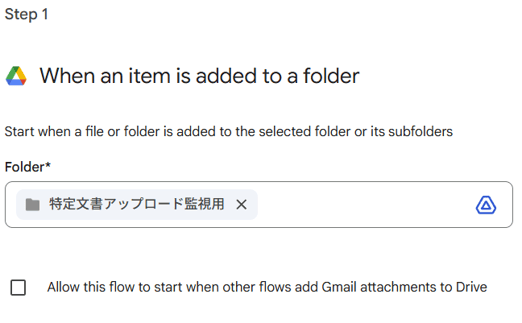 「ファイルが特定のフォルダに作成されたとき」をトリガーとし、監視対象フォルダが更新されると起動します。