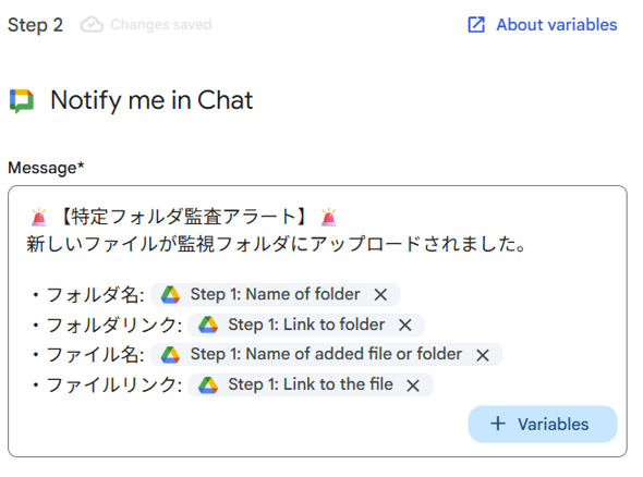 | 実現すること | 監視対象のフォルダに新しいファイルがアップロードされた瞬間を検知し、監査担当者が所属する専用チャットスペースへ、ファイルのURLを含む監査依頼アラートを即座に送信します。 |