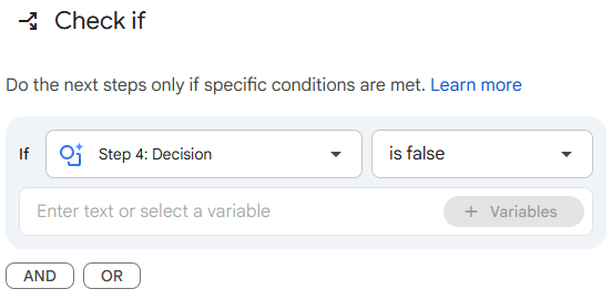 そして、もう一度Step4のDecideの内容によって処理を変更するステップを設定します。Step7の「Check if」は社内ドメインではない場合の処理となるので「Step4: Decision」が「is false」となるようにしてください。