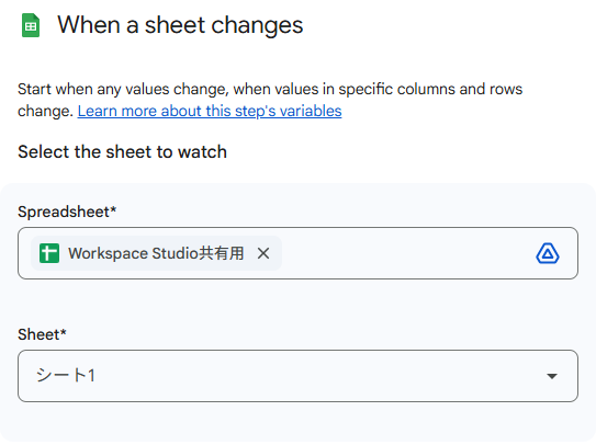 スターターとして「When a sheet changes」を設定し、事前に準備したスプレッドシートが更新されたことを検知したタイミングでエージェントが起動します。