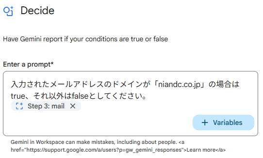 次のActionsでは「Decide」を選択します。社内ドメインの人にしかメッセージはおくらないようにしたいため、抽出したメールアドレスのドメインが「niandc.co.jp」かどうかの判定を実施するようにします。Enter a promptの欄には「入力されたメールアドレスのドメインが「niandc.co.jp」の場合はtrue、それ以外はfalseとしてください。」と入力してから、「Step3: mail」をVariablesから設定するようにしてください。