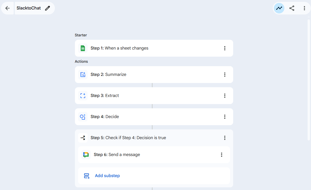 続くアクションでは、まず「Summarize」ステップでスプレッドシートに連携されたSlackのメッセージの内容の要約を実施し、その後の「Extract」ステップでメールアドレスとChatに連携するべき内容を抽出します。そして、次の「Decide」ステップで抽出したメールアドレスが社内ドメインかどうかを判定し、「Check if」ステップで社内ドメインの場合は、対象のメールアドレスのChatに連携するための「Send a message」ステップを実行します。