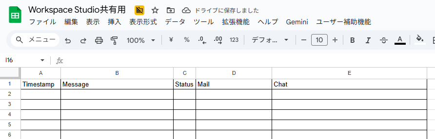 Slackからのメッセージを取得して記録するためのスプレッドシートを「Workspace Studio共有用」準備します。今回はTimestamp, Message, Status, Mail, Chatの5列の構成で作成するようにします。