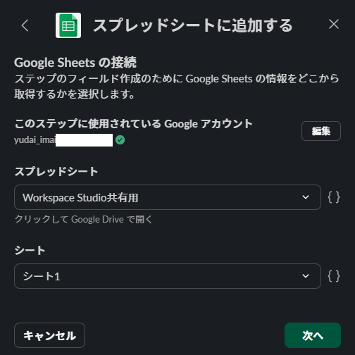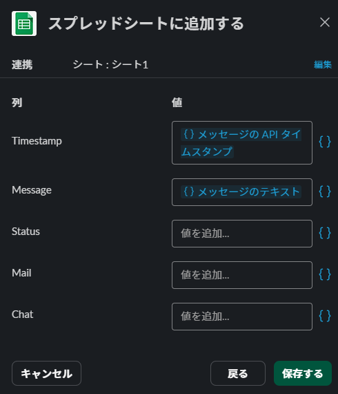 そして、ワークフローが実行する内容はスプレッドシートに投稿されたメッセージの内容を追記するという内容にしています。スプレッドシートにはTimestampとMessageのみ追加するように設定します。他の項目はWorkspace Studio側で追記します。