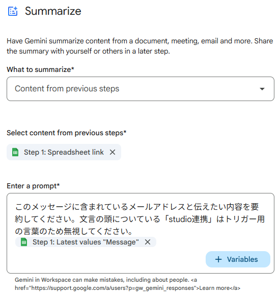 最初のActionsでは「Summarize」を選択します。What to summarizeのプルダウンには「Content from previous steps」を選択し、Select content from previous stepsには「Step1: Spreadsheet link」を設定してください。そして、Enter a promptの欄には「このメッセージに含まれているメールアドレスと伝えたい内容を要約してください。文言の頭についている「studio連携」はトリガー用の言葉のため無視してください。」と入力してから、Variablesから「Step1: Latest values "Message"」を追加します。