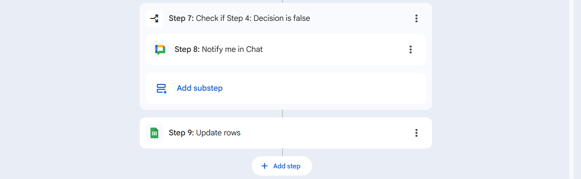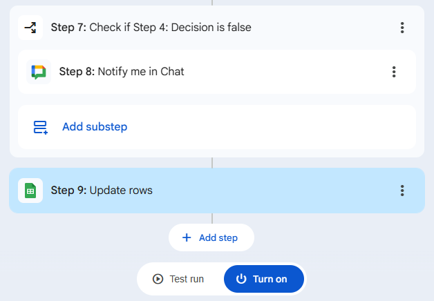 そして、「Decide」ステップで抽出したメールアドレスが社内ドメインではない場合として、「Check if」ステップで対象のドメインでない場合を設定し、自分自身にChatに連携するための「Notify me in Chat」ステップを実行します。そして、最後にチャット連携が終わったことを記録するための「Update rows」でスプレッドシートを更新します。