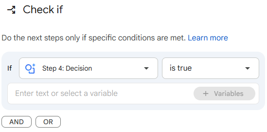 そして、Step4のDecideの内容によって処理を変更するステップを設定します。Step5の「Check if」は社内ドメインの場合の処理となるので「Step4: Decision」が「is true」となるようにしてください。