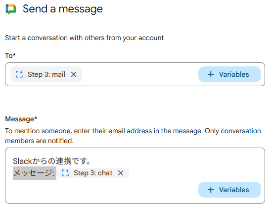 そして、最初のサブステップである「Send a message」ではToの欄に「Step3: mail」をVariablesから設定し、Messageの欄には「Slackからの連携です。メッセージ: 」と入力してから、「Step3: chat」をVariablesから追加するようにしてください。