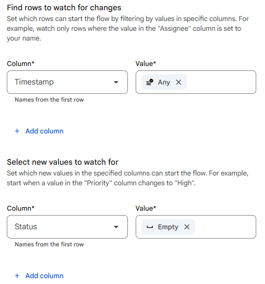 Starterで「When a form response comes in」を選択します、そして、Spreadsheetには先ほど作成した「Workspace Studio共有用」を選択し、Sheetには「シート1」を選択します。Find rows to watch for changesはメッセージが追加されたときにエージェントが動くようにしたいため、Columnには「Timestamp」を、Valueには「Any」を設定します。Select new values to watch forはメッセージが追加されたときに動くものの最初はStatusは常に空欄となることが条件のため、Columnには「Status」を、Valueには「Empty」を設定します。