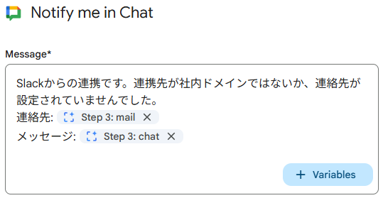 そして、サブステップには「Notify me in Chat」を設定し、Messageの欄には以下のプロンプトを入力してください。[]で囲まれている内容はVariablesから追加するようにしてください。
