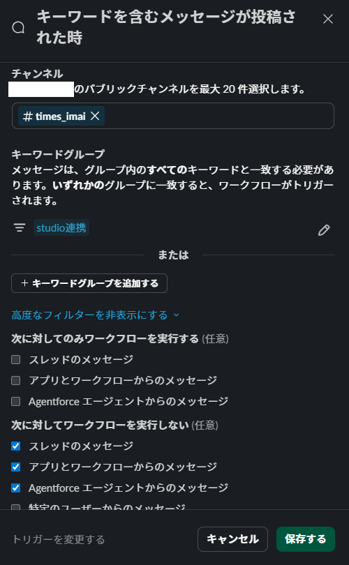 そして、ワークフローの開始条件としては、特定のキーワードが特定のチャンネルで投稿されたときという設定にします。今回は、私がいつも使うパブリックチャンネルである「times_imai」で、「Workspace Studio連携」という文言が含まれているメッセージが投稿されたら動くように設定しました。他の条件は画像の内容を確認してください。