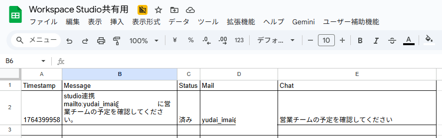 そうするとスプレッドシートに自動で追加されます。私が確認したときにはすでにWorkspace Studioが動いた後となっていたので、すでにStatusやMail、Chatの項目が更新された後になっていました。