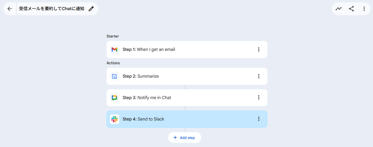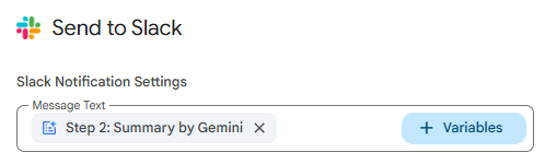 今回はこちらのブログのStepの末尾にSlackへ送る処理を追加してどのようにメッセージが送られてくるかを確認してみます。「Send to Slack」のStepにあるMessage Textの欄にStep2で要約した内容を追加します。