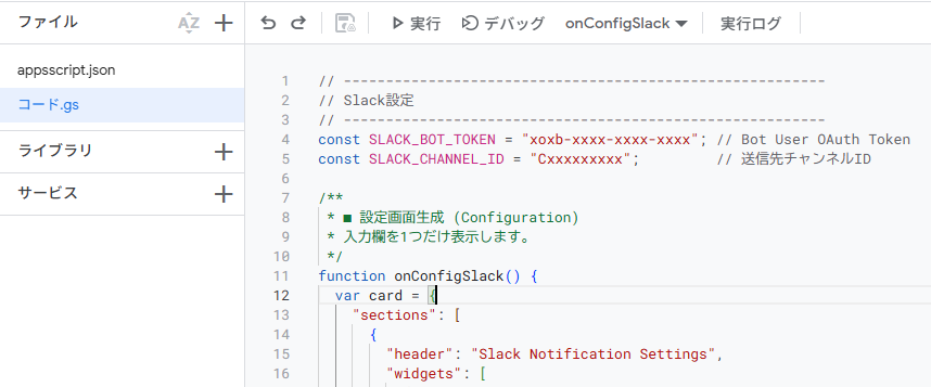 const SLACK_CHANNEL_ID = "Cxxxxxxxxx"; // 送信先チャンネルID