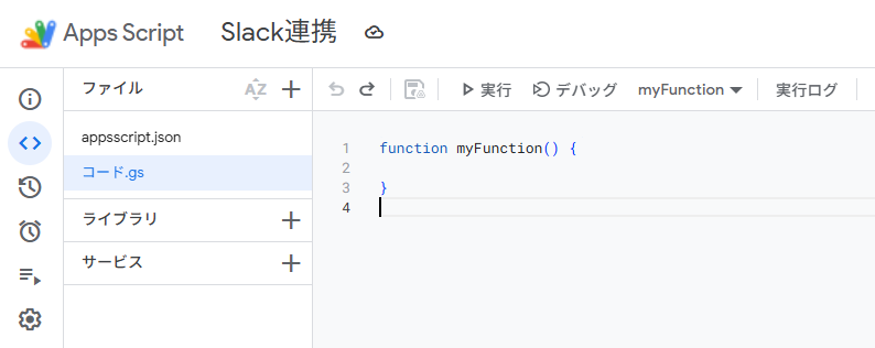 そして、ファイルの中の「コード.gs」ファイルを選択して、エディタに以下の内容を入力して保存してください。