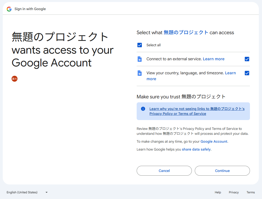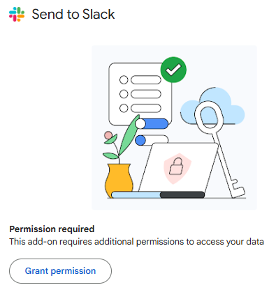 初めてこのStepを設定すると以下のような認証を要求する画面が出てきます。「Grant permission」を選択して認証を順番に実施してください。
