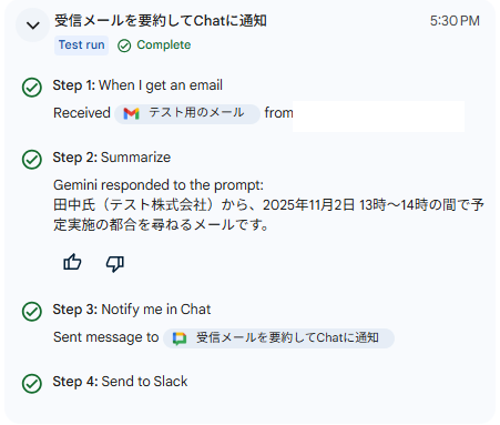 そして、Test runからテスト用のメールでテスト実行してみました。以下の内容が実行履歴から確認することができました。この時のStep2の内容がSlackに連携されます。