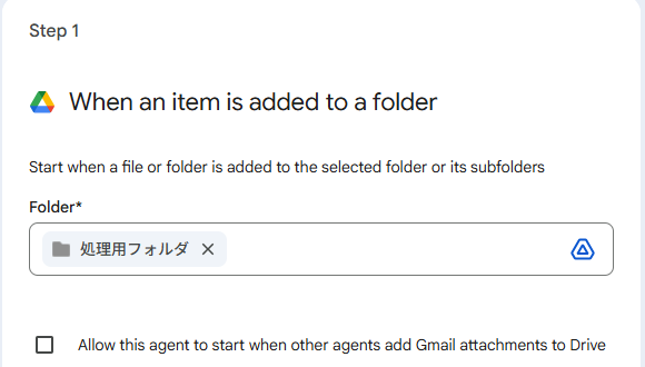 トリガーを「When an item is added to a folder」にして、事前準備したフォルダを指定します