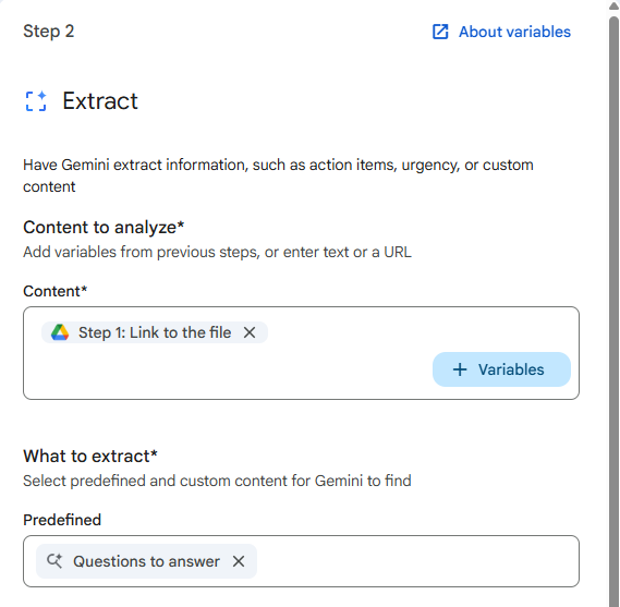 What to extractでは、どんな項目をこのファイルから読み取るかを指定させます。取り出したい項目をGeminiに探してきてもらうために「Questions to answer 」にしています