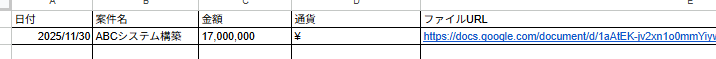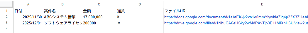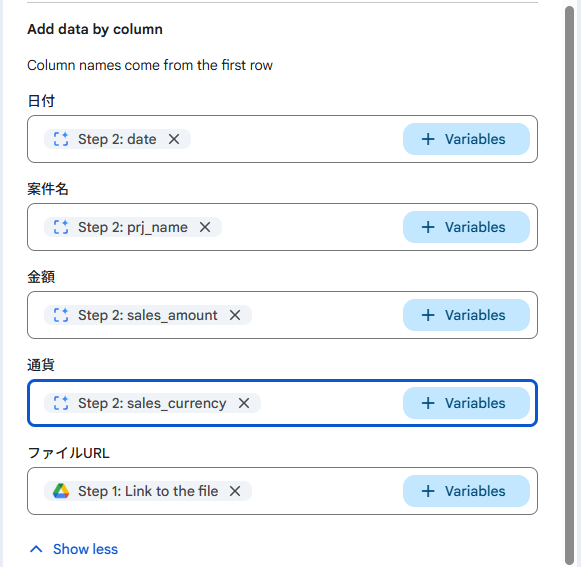 ここで行1に定義した項目「日付」「案件名」「金額」「通貨」はファイルの中身から読み取る値を、「ファイルURL」はファイルが作られたというイベントを受けてWorkflowsが検知した値を入れる想定です。