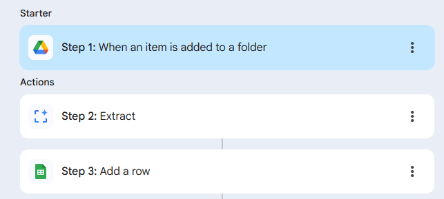 特定フォルダにファイルが配置されたら、その中から必要な項目を抽出して、Spreadsheetに書き込む、という3Stepを作るだけです。