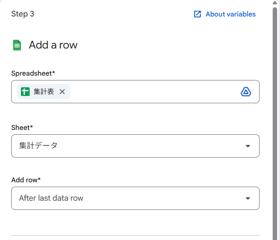 ここまでで変数化されたデータを、集計用のSpreadsheetに書き込みます