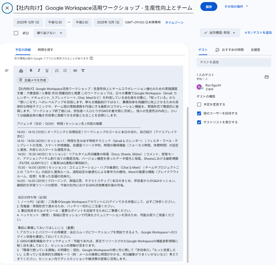 カレンダーへの情報の掲載方法は、人によって大きく異なるというのが実情です。カレンダーの説明部分に書くケース、「イベントの詳細はこちらです」と別途スライドなどを案内するケース、いずれもあるでしょう。ただしそれゆえに、参加者が事前にやっておかなければならないことを見落とす、ということも起きかねません。