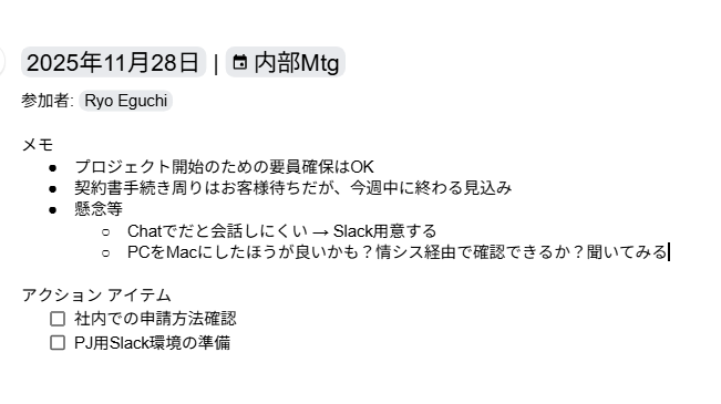 さらに、添付されている前の打合せ「内部Mtg」のメモにもアクションアイテムが書かれています。
