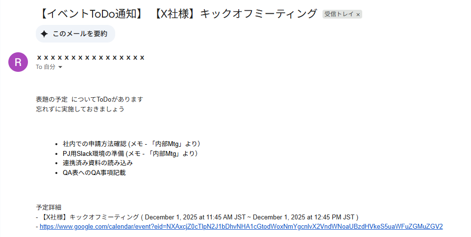 イベントの内容をサマライズして、ToDoがあればメールを送る。というだけのものです。メールの部分は他のお好みの通知方法に変えるのも良いでしょう